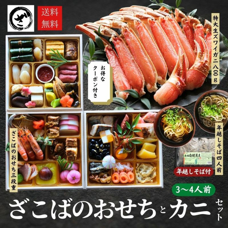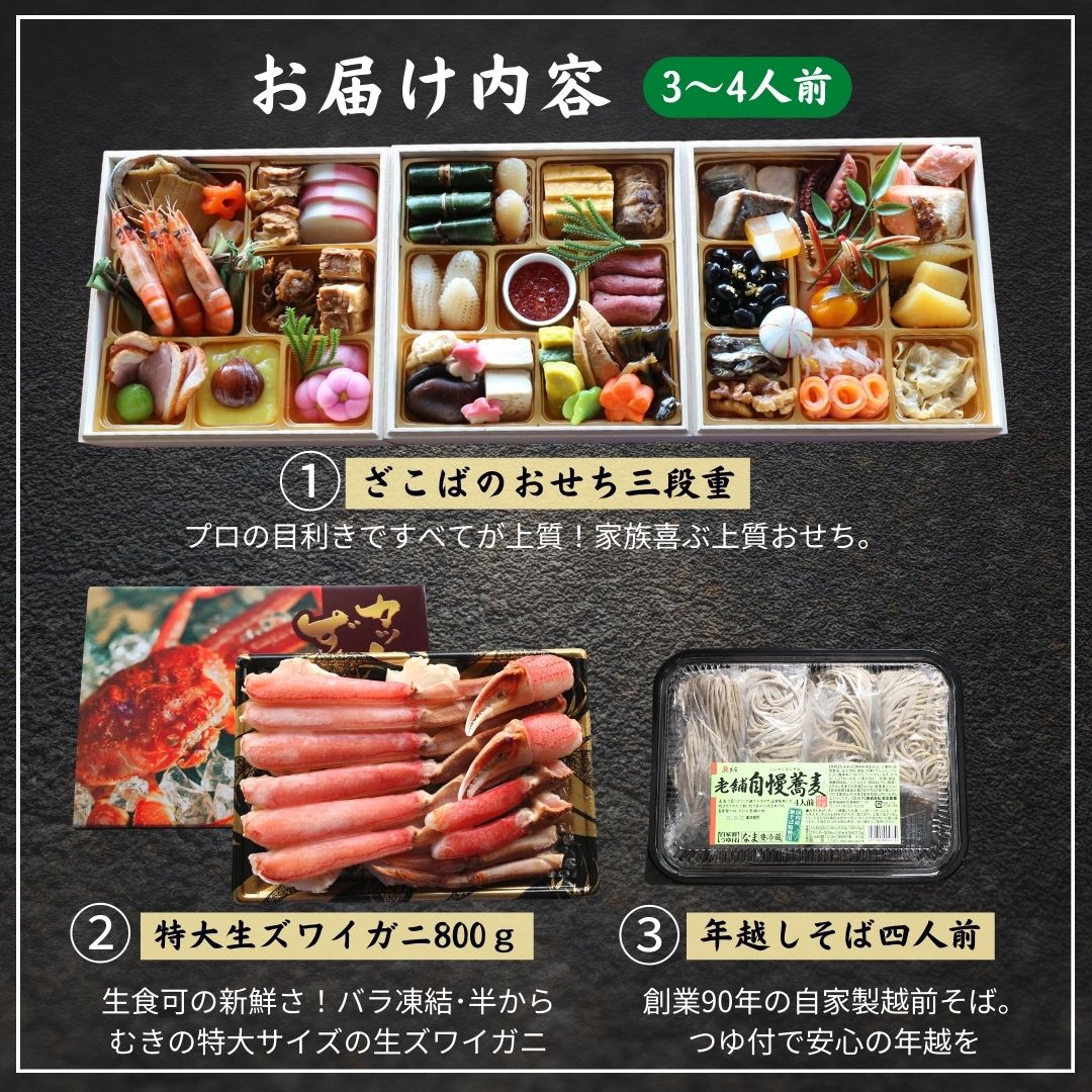 名称 | ざこばのおせち三段重+極上【特大】生ズワイガニ 800g+年越し場そば |