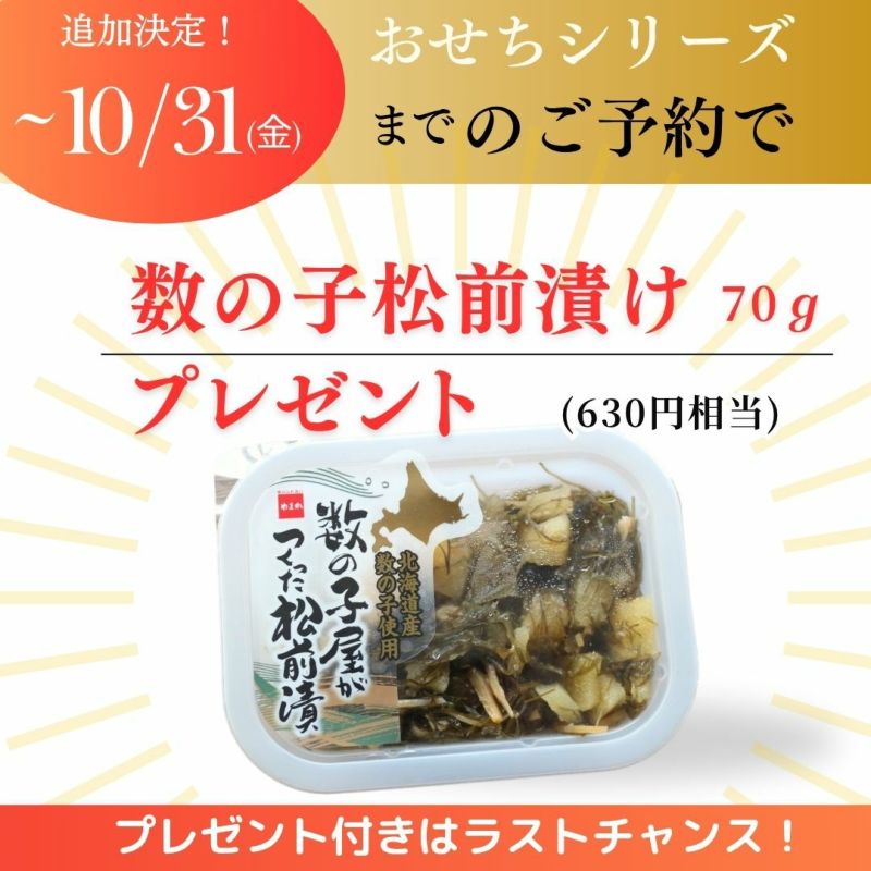 内容量 | おせち:6.5寸 三段重 3~4人前 合計48品 総重量2.3kg(正味重量1.5kg)、極上【特大】生ズワイガニ 800g、年越しそば4人前(つゆ付) |