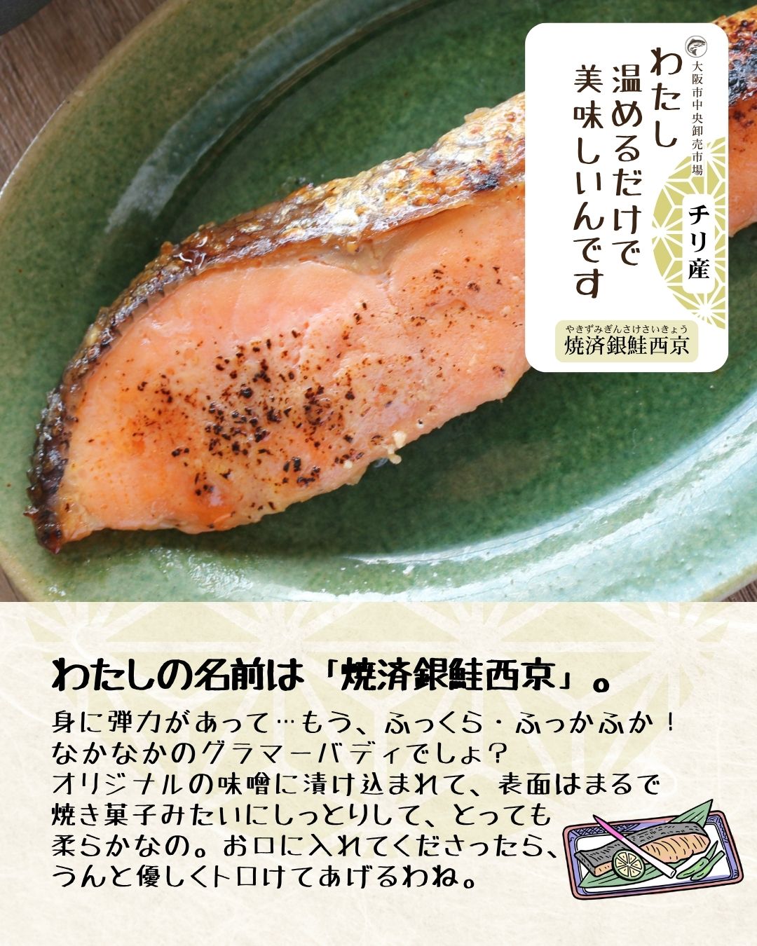 ⑤焼済 銀鮭西京漬(味噌漬け)-銀鮭(チリ産)、米味噌、(米、大豆、食塩)、本味醂、砂糖、清酒、(一部に大豆、さけを含む)