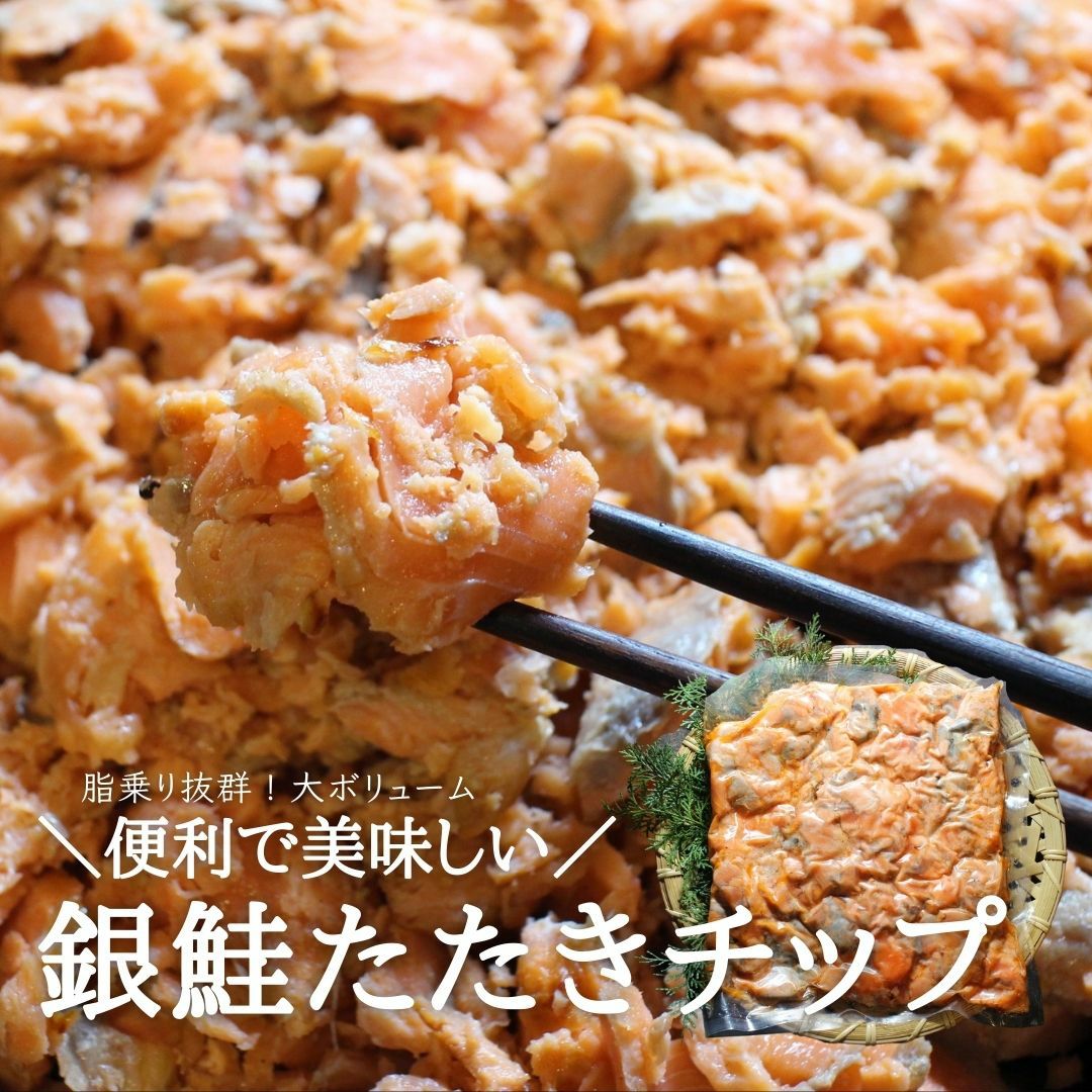 色んな料理に使える優れもの!!塩のみのシンプル味 【生食用】銀鮭タタキチップ1kg お刺身 サーモン 塩鮭 新巻鮭 フレーク 無添加 たたき 切り落とし お得用 いつもの鮭 生食サーモン 鮭おつまみ
