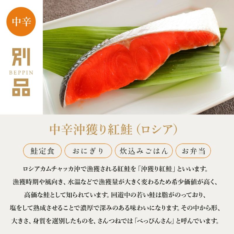 ②別品ー中辛沖獲り紅鮭(ロシア) ロシアカムチャッカ沖で漁獲される紅鮭で、回遊中の若い鮭は脂がのっており、塩をして熟成させることで濃厚で深みのある味わい。