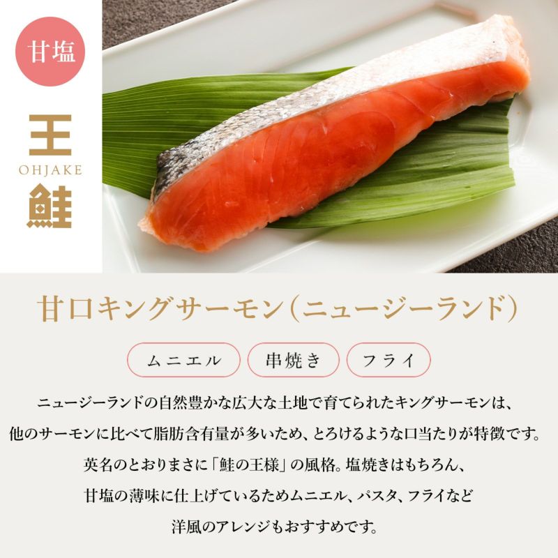 ④王鮭ー甘口キングサーモン(ニュージーランド) ニュージーランドの自然豊かな広大な土地で育てられたキングサーモンは、他のサーモンに比べて脂肪含有量が多いため、とろけるような口当たりが特徴です。