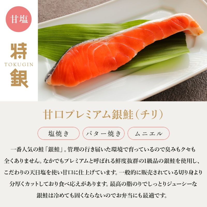 ⑤特銀ー甘口プレミアム銀鮭(チリ) 一番人気の鮭「銀鮭」。なかでもプレミアムと呼ばれる鮮度抜群の1級品の銀鮭を使用、こだわりの天日塩を使い甘口に仕上げ。