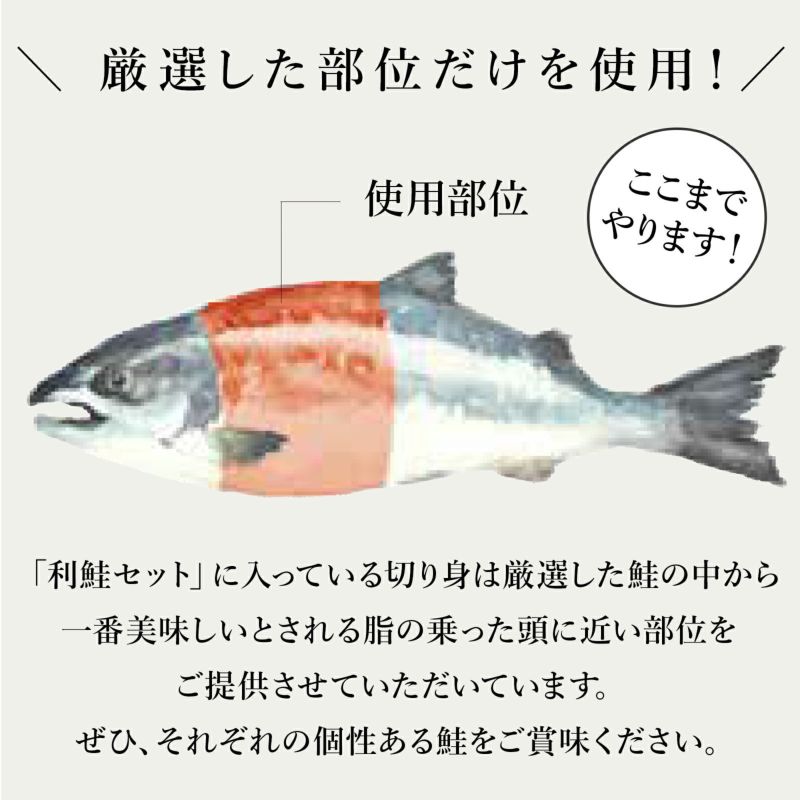 利鮭セット」に入っている切り身は厳選した鮭の中から一番美味しいとされる脂の乗った頭に近い部位をご提供させていただいています。