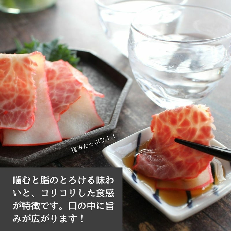 原材料表記 鯨肉(アイスランド、北西太平洋)、食塩、還元水あめ、乳たん白、しょうゆ、オルニチン、植物油脂、/㏗調整剤、リン酸塩(Na)、増粘剤(酢酸デンプン、増粘多糖類)、コラーゲン、調味料(アミノ酸等)、酸化防止剤(V.C,V.E),保存料(ソルビン酸K),発色剤(亜硝酸Na),ヒアルロン酸、くん液、着色料(アナトー、赤3)、(一部に乳成分・卵・小麦・大豆・ごま・豚を含む)