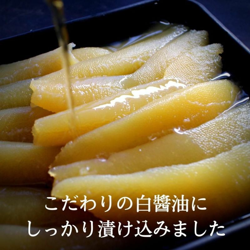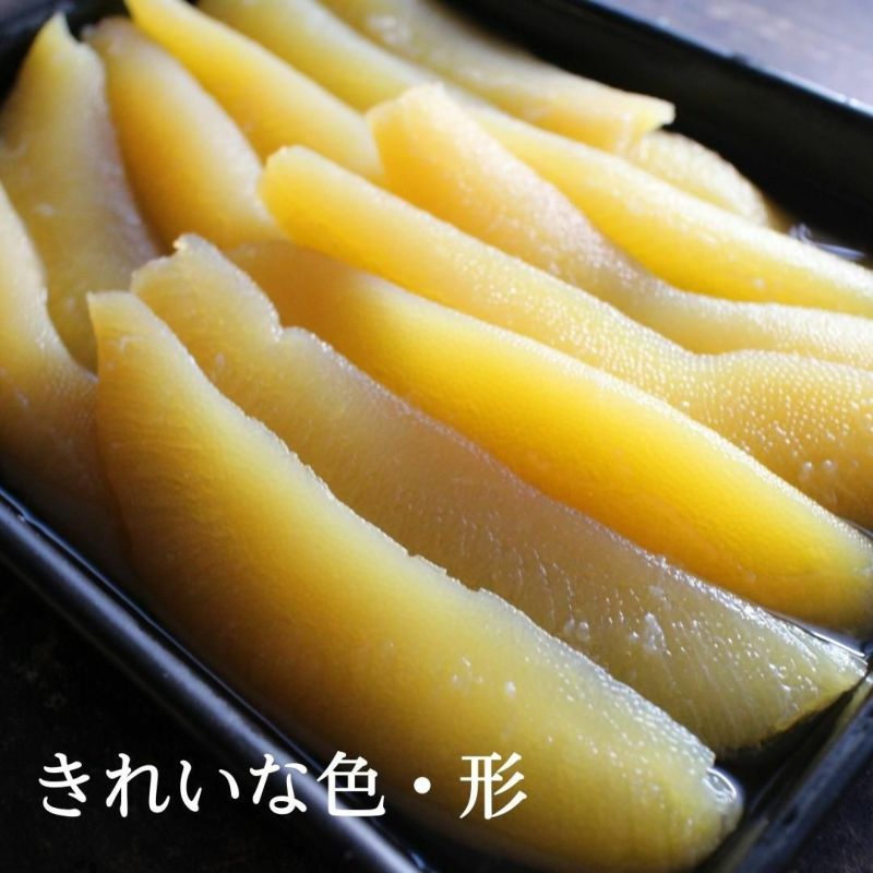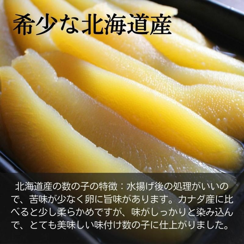 北海道産の数の子の特徴は、水揚げ後の処理がいいので、苦味が少なく、卵に旨味があります。カナダ産に比べると少し柔らかめでさすが、味がしっかりと染み込んで、とても美味しい味付け数の子に仕上がりました。