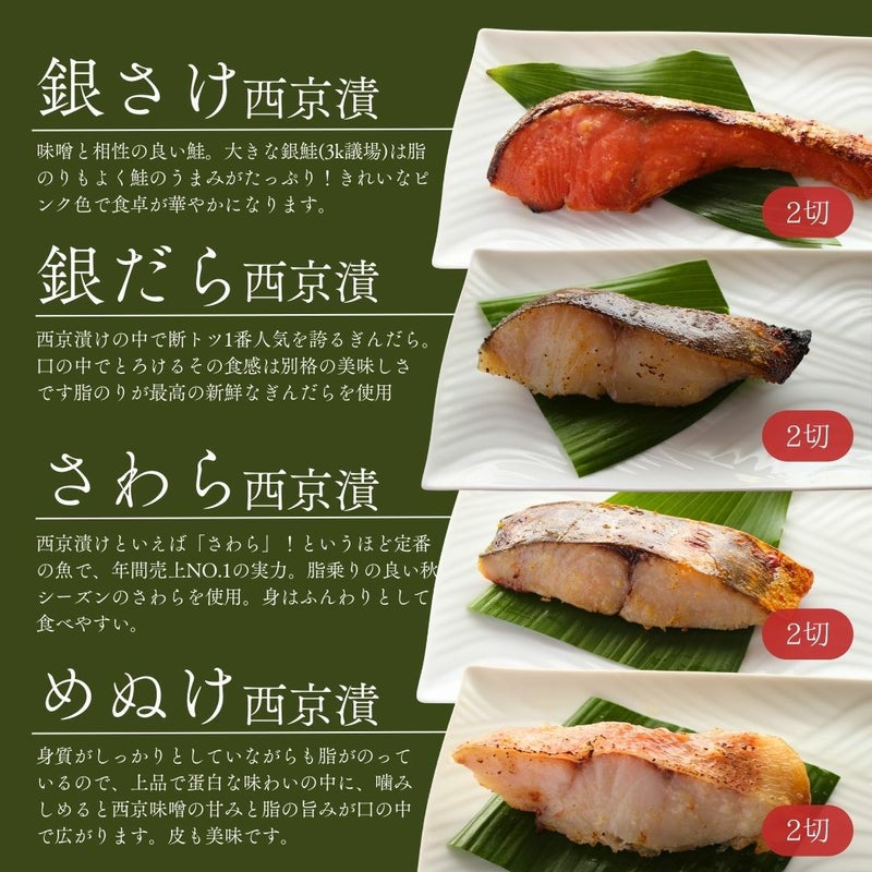 内容量 銀だら、さわら、銀鮭、めぬけ、各2切入 計8切