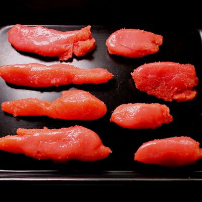 原材料表記 明太子ースケソウダラの卵(アメリカ又はロシア産)食塩、発酵調味料、唐辛子、かつお風味調味料、醤油、調味料(アミノ酸等)、甘味料、(ソルビット)、酸化防止剤(ビタミンC)、香辛料、ナイアシン、酵素、着色料(赤102、黄5、赤3)発色剤(亜硝酸Na)(原材料の一部に小麦、大豆を含む)原料原産地は当社における前年の取り扱い実績の多い順に表示しています。