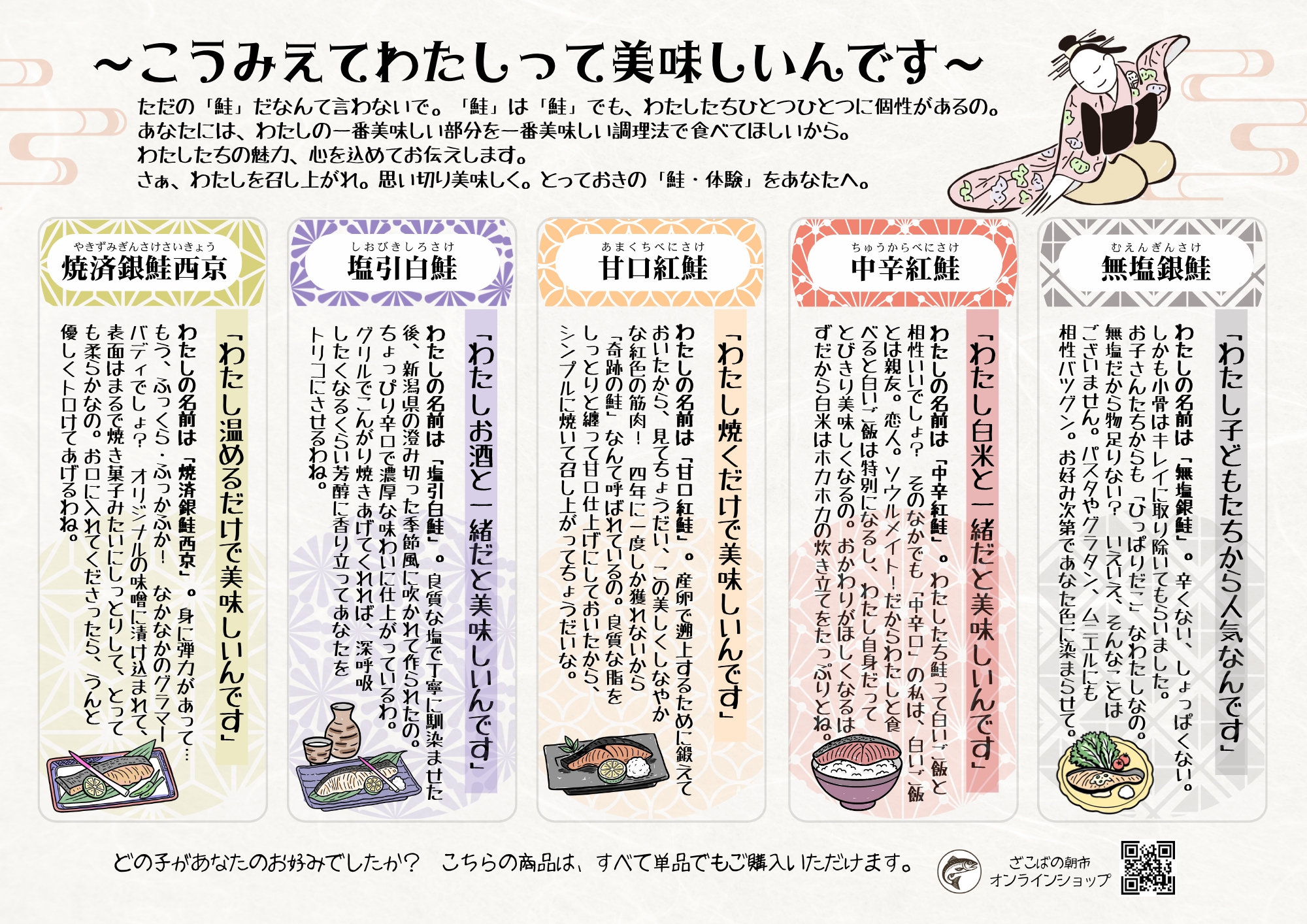 なんとなんと! 「鮭」ごとに、一番美味しい食べ方を、「鮭」たちが自らアピールしているというセット内容!