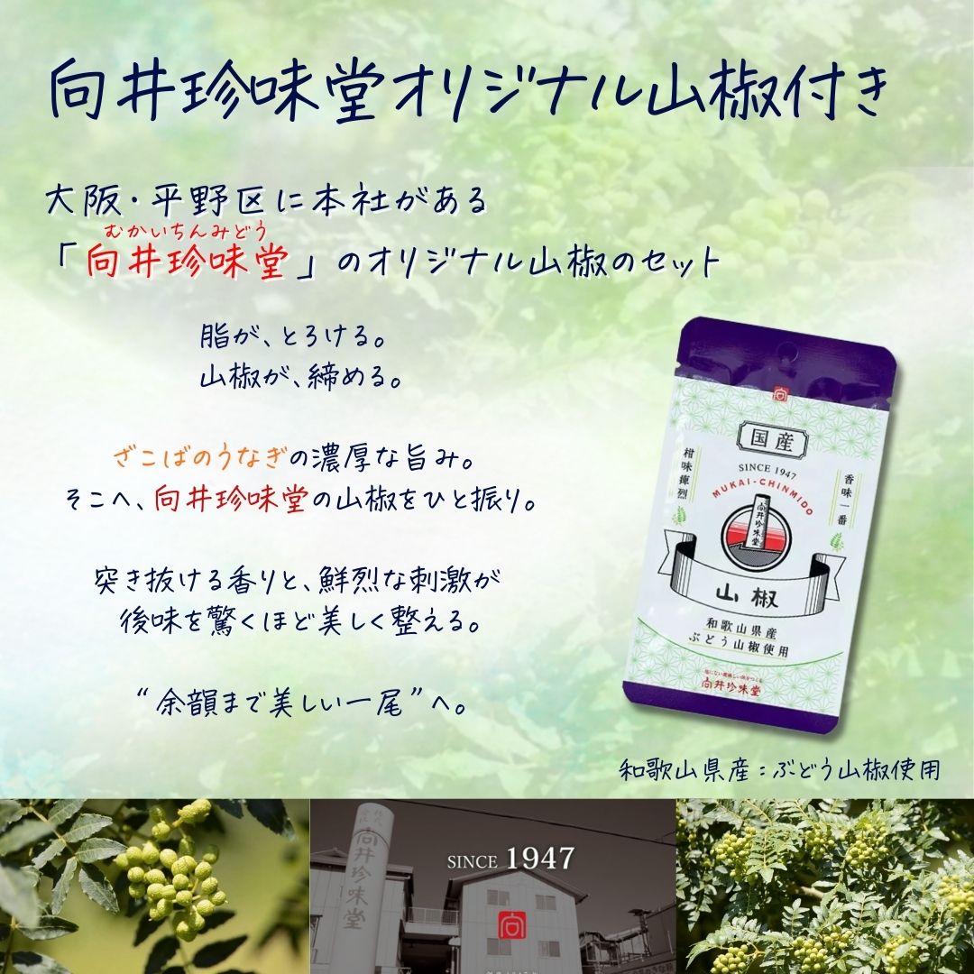 香ばしい鰻の蒲焼きにフワリとそよ風を纏わせたよう。香りの高さと爽やかな風味が楽しめる向井珍味堂の山椒を一緒にセットさせていただきました。鰻丼にはもちろん、焼き鳥やパスタ、サラダなどさまざまなお料理にお使いいただけます。
