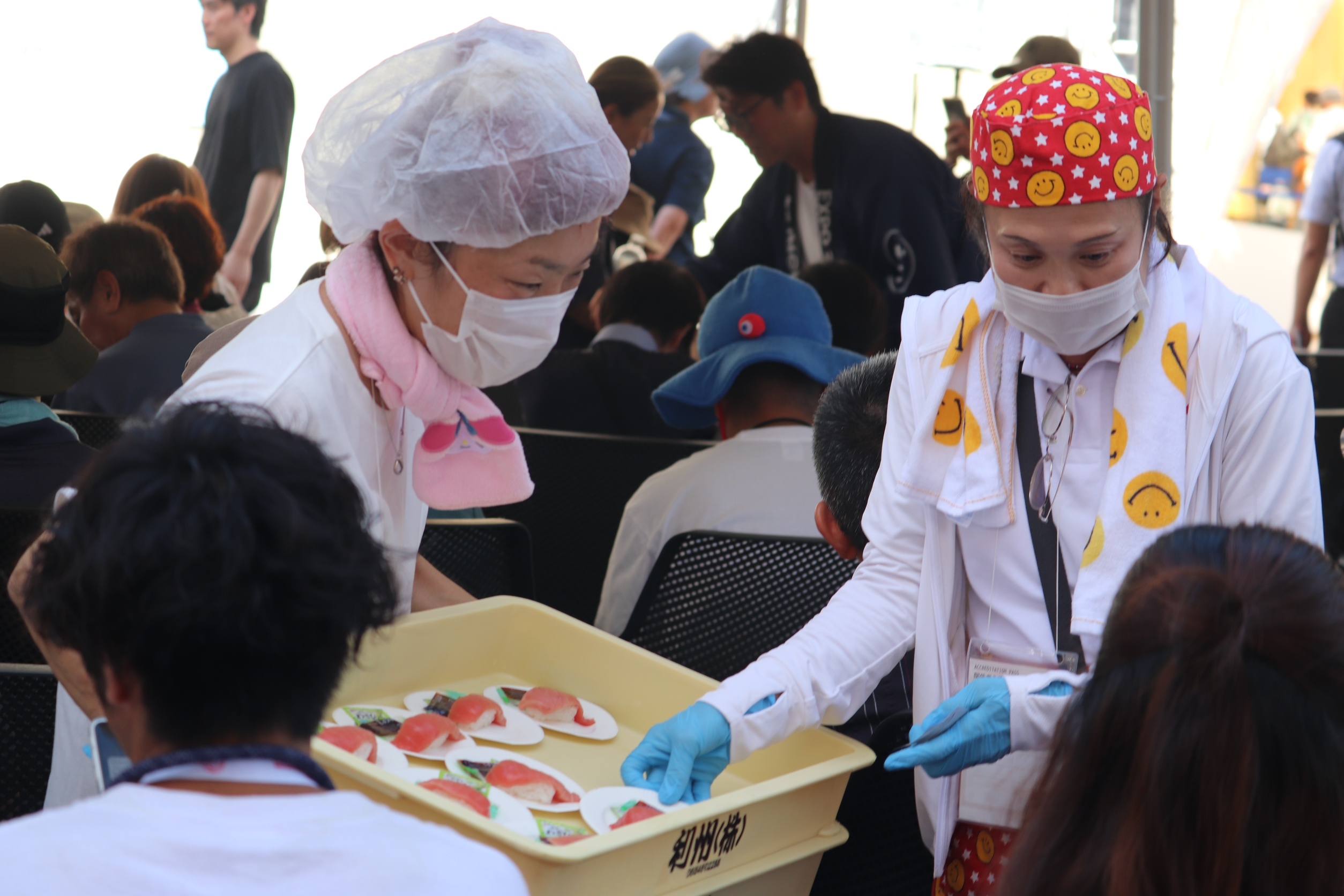 準備と配膳を担当してくださったのは、「ニコニコそば打ち同好会」の皆さん! 「ざこば」イベントでも、毎回そば打ち体験でお世話になっている方々です。朝早くからお集まりいただいたうえ、午前・午後合わせてなんと300食ものマグロのお寿司を準備、お客様へお配りくださいました🤗 実はこればかりは、事前に練習も皆さんとの打ち合わせも何もできていなくて💦 時間通りに進行できるだろうか、お客様をお待たせしてしまわないだろうか…等々、心配しかありませんでした。ですが、皆さんのチームワークのおかげで、完璧なまでにスムーズな準備・配膳をおこなっていただくことができました。もう、本当に感謝しかないです。皆さま、本当にありがとうございました!